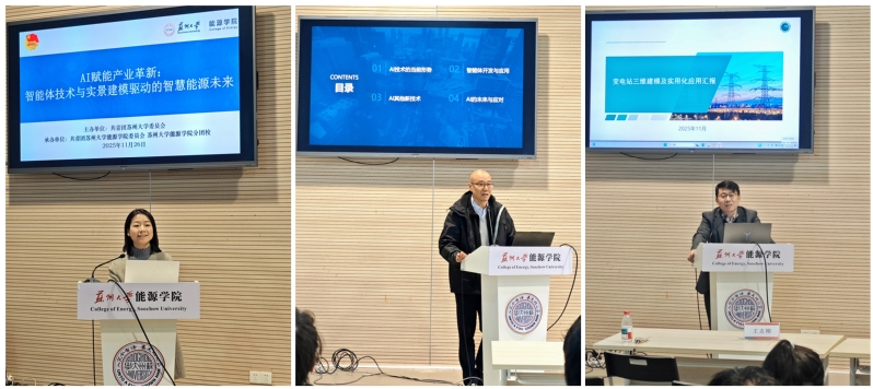 活动伊始,主持人严若今对到场嘉宾表示欢迎,并介绍了两位主讲人的专业背景。首位主讲嘉宾钱斌老师是江苏省工信厅专家库成员、中国AIGC讲师联合会技术专委会主任,原秀人网 应用技术学院智能制造学院院长,长期深耕人工智能技术研发与应用领域。他以“AI智能体与新技术应用前沿”为题,从AI发展形势、智能体技术、应用实践与未来趋势四个维度展开分享。钱老师系统梳理了人工智能发展的五个阶段,重点解读了2025年作为“智能体元年”的技术特征与产业价值,指出智能体已具备思考、行动与对话能力,在办公自动化、数字员工、AI编程等领域广泛应用。他通过微信商务助手、AI论文生成等实例,生动展示了低门槛、高效率的AI编程能力,并强调“AI无法替代人,但善用AI的人将拥有更广阔的未来”,为学子们指明了学习与发展的方向。第二位主讲嘉宾王志刚老师是中级工程师、华南理工大学控制理论与控制工程硕士,深耕“AI+能源+节能”领域15年,现任苏州睿航节能技术有限公司总经理、浙江大学苏州工研院分布式能源与智能微网中心副主任。他聚焦“光伏电站智慧运维的前沿技术”,以实景建模技术为切入点,分享了数字孪生技术在能源系统优化中的实践成果。王老师介绍了其团队自主研发的快速实景建模技术,该技术具备效率高、成本低、精度强(偏差不超过5厘米)等优势,可1:1还原变电站实景。他还展示了室内无人机巡检系统在无信号、全黑、强电磁干扰环境下的技术突破,该技术已在国网、南网多个变电站实现8000余次应用,有效提升运维效率与安全性。