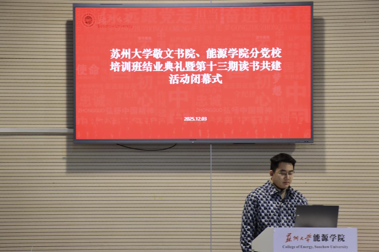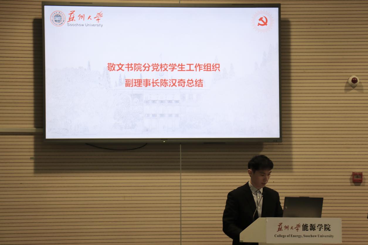 最后,敬文书院分党校副理事长陈汉奇作述职报告。报告围绕组织概况、组织架构、工作内容、未来展望及特别鸣谢等五个核心维度展开,系统总结了本期分党校培训与读书共建活动的整体推进情况。报告中既回顾了两院分党校学生工作组织的建设基础与运行架构,也梳理了本期集中授课、读书交流、主题实践等关键活动的开展情况,同时明确了后续工作的开展方向,并对校党校指导、两院老师支持及全体成员的参与表达了诚挚感谢。
