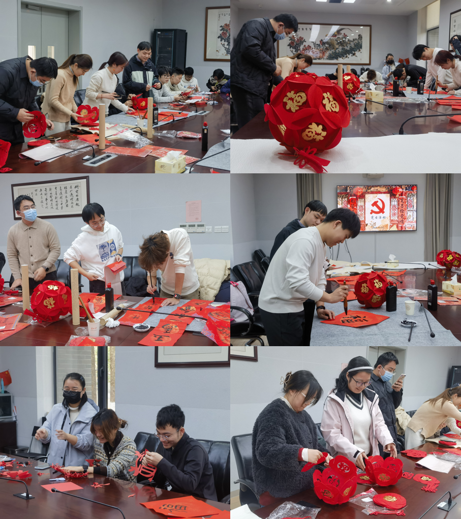 活动伊始,会议室里已洋溢着浓厚的节日氛围。红纸铺展,墨香淡淡,各式制作材料整齐摆放。大家纷纷拿起自己感兴趣的物品,兴致盎然地开始动手。剪纸区域,大家手持红纸与小巧的剪刀,在老师的分步指导下细心雕琢。随着纸屑轻轻飘落,精美的“福”“喜”字、栩栩如生的窗花、象征吉祥的图案逐渐呈现于掌心,红艳艳的剪纸作品映照着大家专注而喜悦的脸庞。春联书写区更是墨香四溢,师生们铺开喜庆的红纸,挥毫泼墨,凝神运笔。一句句饱含祝福的联语跃然纸上,或遒劲有力,或端庄秀雅,既有对家国昌盛、学院发展的美好祝愿,也表达了党员们不忘初心、牢记使命的坚定信念。灯笼制作区同样热闹非凡,大家相互协作,搭建骨架、装饰穗坠,巧手翻转间,一盏盏透着暖光、造型别致的红色灯笼制作而成,为冬日会议室增添了融融暖意。