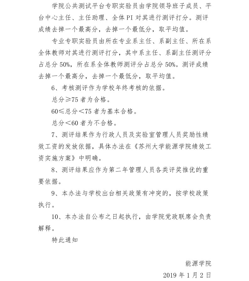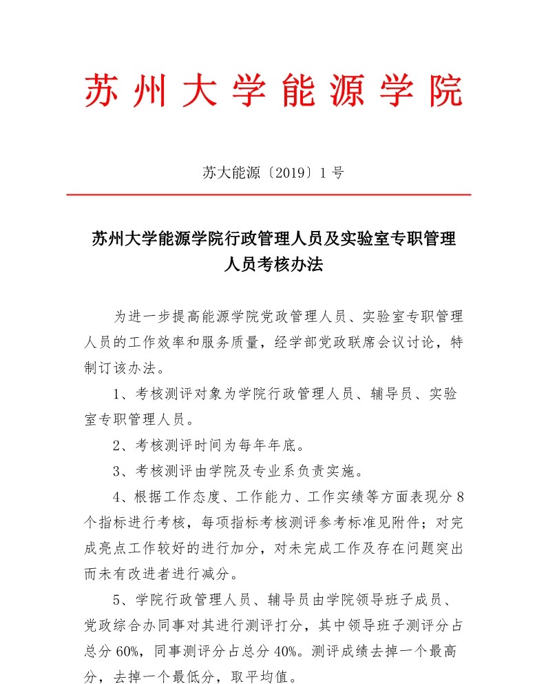 秀人网 行政管理人员及实验室专职管理人员考核办法 苏大能源〔2019〕1号