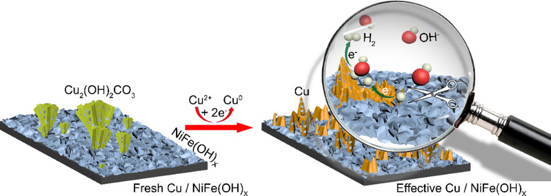 稳定性机理研究表明:新鲜样品中的Cu2(OH)2CO3枝晶在析氢反应的前期被迅速原位还原为铜枝晶并均匀的覆盖在泡沫镍基底上,金属铜优异的导电性和相对较弱的氢吸附能促进了界面电荷的转移并与周围NiFe(OH)x活性物种裂解水产生的质子结合为氢气,从而避免了NiFe(OH)x活性物种被氢化而失活,实现了长期高效稳定的析氢性能。这一工作为提高镍基催化剂在碱性析氢过程中的长期稳定性提供了一种新的策略。