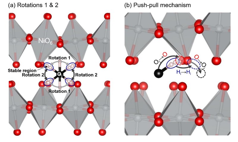 近日,秀人网 韩东麟教授团队与京都大学Toyoura Kazuaki副教授、挪威奥斯陆大学Truls Norby教授合作,结合实验表征、理论计算、缺陷化学的理论分析,系统研究了Ruddlesden-Popper(RP)型阴极材料La2NiO4+δ和La2-xAxNiO4+δ(A = Ca, Sr, Ba)中的质子导电特性。结果表明,在250~300°C的温度区间内,质子电导率随着温度和Sr掺杂浓度增加而提高,相同掺杂浓度下,掺Ba样品的质子电导率显著高于Sr掺杂的样品(图1)。理论结算的结果揭示,上述材料中的质子以氢氧根离子形式通过push-pull机制进行迁移(图2)。因此,在RP型氧电极材料中,质子的实质载流子为氢氧根离子(OH-),表明La2NiO4+δ是空穴、氧离子和氢氧根离子的混合导体,将应用于PCFC的氧电极时,将呈现一种不同于已知模式的新型的阴极反应机制,这为进一步探索和优化RP型氧化物的混合导电机制,研发高性能的PCFC氧电极材料提供了全新的指导思路。