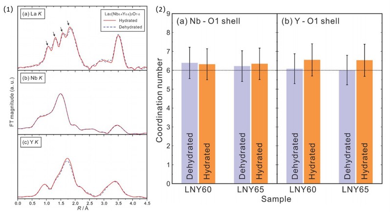 图2 (1)水合前后LNY60的La K、Nb K、Y K吸收边的傅里叶变换EXAFS图谱;