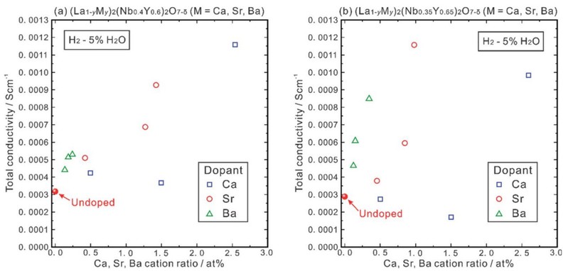 近日,秀人网 韩东麟教授团队使用低温EXAFS分析了质子导电型烧绿石氧化物La2(Nb0.4Y0.6)2O7-δ(LNY60)和La2(Nb0.35Y0.65)2O7-δ(LNY65)中的有效掺杂位置。如图2所示,LNY60和LNY65的水合前后的EXAFS对比分析显示,水合后La和Y附近的阳离子配位数增加,且局部晶格结构发生了膨胀,表明La和Y位是掺杂的有效位置。因此,采用二价的Ca、Sr和Ba阳离子对三价的La进行了掺杂,如图3所示,质子电导率随着Ca、Sr和Ba掺杂浓度增加而升高。特别是,2.54 at%的Ca掺杂的LNY60,以及0.98 at%的Sr掺杂的LNY65在700°C时的电导率均达到1.16×10-3 Scm-1,比未掺杂样品的总电导率高出近四倍。上述结果表明,借助EXAFS分析可准确地确定合适的掺杂位置,进而指导精准掺杂来提高固体氧化物中的质子电导率。