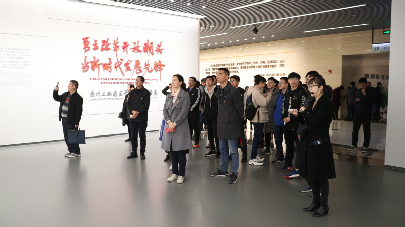 随着旋转门进入大厅,跃入眼帘的是干净整洁的大理石地面,清爽明亮的玻璃幕墙,高清巨屏里播放着的是苏州园区的航拍美景。首先在讲解员的带领下,全体成员参观展馆一层。该层作为苏州工业园区25周年成果展的专题展区,分为序厅、中新合作、发展历程、改革开放试验田、产业发展、东部新城等板块,展示园区由来的时代背景并细数建区以来的建设成就。