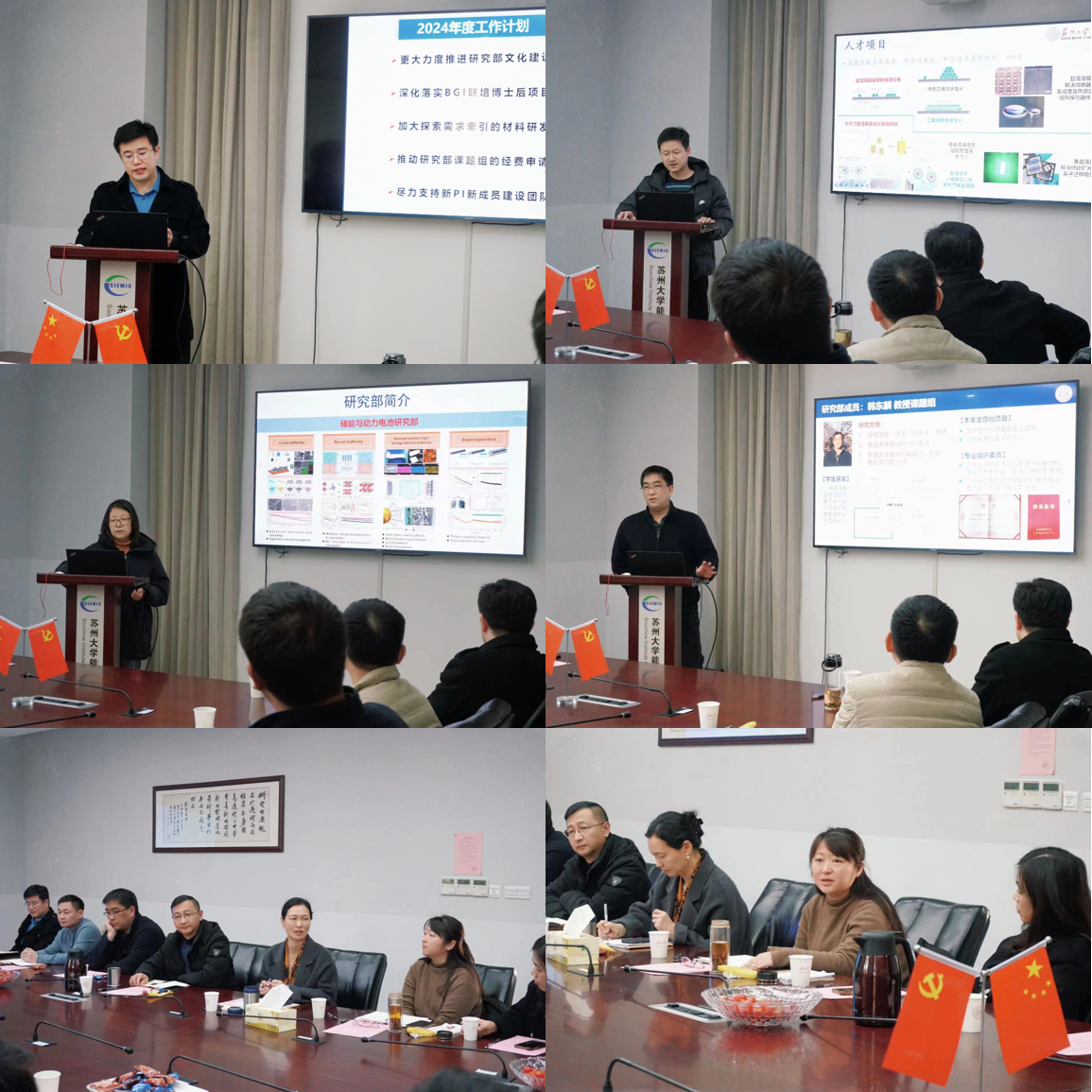 会议伊始,孙靖宇教授首先汇报了上一年度研究院整体工作情况,接着详细介绍了先进碳材料研究部本阶段的各项工作,并提出了下一年度的工作计划:更大力度推进研究部文化建设、更加注重人才培养与引进、加大探索需求与牵引。杨新波教授对太阳能利用与转化研究部年度工作进行了总结汇报,提议大家要“走出去”,不仅仅要参加学术会议,也要多参与企业界科技会议,了解当今产业化技术痛点,有针对性地解决技术问题。储能与动力电池研究部部长杨瑞枝教授强调,各部门内部研究方向是比较接近的,大家要加强团队协作、做好组间交流,携手前进。韩东麟教授代表未来能源技术研究部最后一个汇报发言,他提到,行动是第一要义,要加强平台申请与建设,以此为抓手将现有资源充分利用,将价值最大化。在场PI也都积极提出意见和建议,为研究院的发展献言献策。大家普遍认为,首先要搭建好研究部各部之间沟通合作的桥梁,以发电、储电、用电为联动,课题组间相互配合,把握学生这一关键群体,提升科研活力。其次要做点有显示度的事情,充分了解苏州地方产业对技术的迫切需求,把握机遇,为区域经济做出贡献。