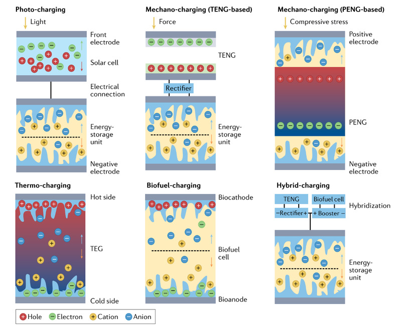 蓬勃发展的柔性电子器件、柔性机器人和物联网等领域对无线电源的依赖日益增长,给数量不断增加的各种功能单元供电也成为了其中一个发展瓶颈。为了满足可穿戴和柔性电子产品日益增长的能源需求,一种直接的策略是增加柔性储能设备的体积容量,包括它们的能量和功率密度。然而,创建具有越来越多功能的集成小型化平台的趋势对可持续供电提出了相当大的挑战。多个单元的高功耗不可避免地导致提前更换电池或频繁充电,造成不便。相比之下,将这些柔性设备的能量密度提高到非常高的水平会带来安全问题,尤其是在可穿戴应用中,这些应用通常会承受重复的机械应力。考虑到这些因素,一个柔性的自充电系统可以从周围环境中获取能量,同时为储能设备充电,而无需外部电源,这将是一个很有前景的解决方案。