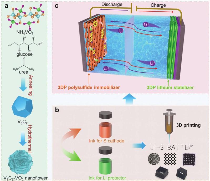 图1. 本研究的思路概况图。(a)是V8C7–VO2异质结的制备流程图,(b)是基于V8C7–VO2异质结的正极硫宿主和负极锂保护层的3D打印墨水制备图和定制化打印图案展示。(c)是基于3D打印双功能骨架配置锂硫电池的工作示意图。