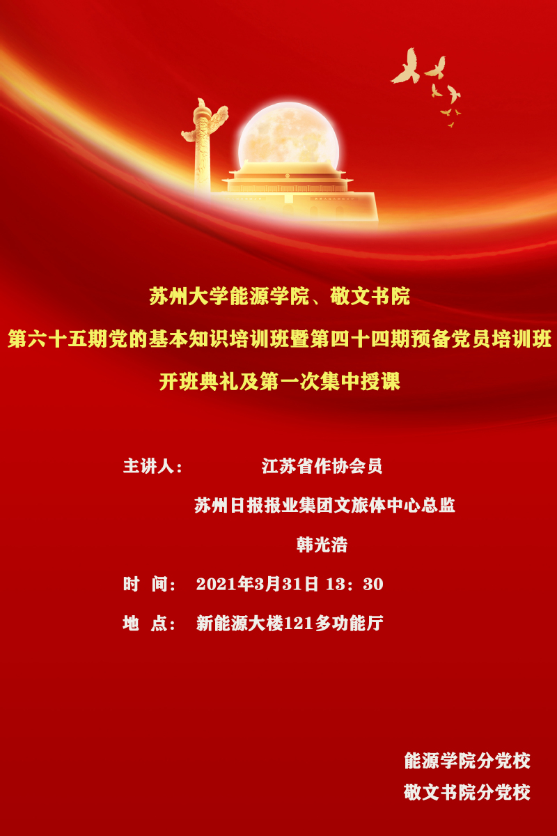 秀人网 、敬文书院第六十五期党的基本知识培训班暨第四十四期预备党员培训班开班典礼及第一次集中授课海报