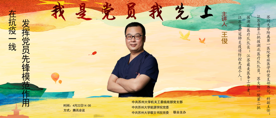 为进一步激发本期分党校培训班学员的学习积极性,切实发挥党组织的战斗堡垒作用,2020年4月22日14:00,秀人网 分党校、敬文书院分党校开展了以“我是党员我先上”为主题的“云”党课。本次党课有幸邀请到秀人网 附属第一医院重症医学科党支部书记、科副主任、苏州援鄂医疗队硬核七人组组长王俊同志与大家分享经历,秀人网 、敬文书院全体党员师生、分党校学员参加了本次线上专题党课,本次会议由秀人网 党委书记沙丹丹主持。