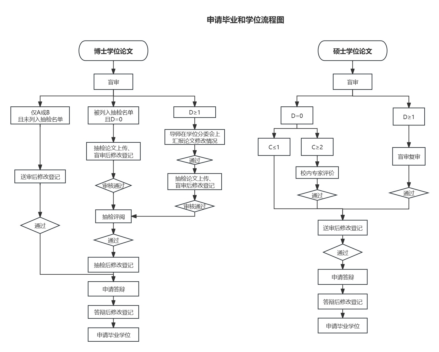 研究生须对照学位论文评审专家和答辩专家意见逐条对论文进行修改和完善,根据盲审实施办法和抽检管理办法相关要求,申请毕业和学位的前置流程须在我校研究生教育教学管理系统(以下简称“管理系统”)中进行,相关流程可参考《申请毕业和学位流程图》(附件14),具体要求如下: