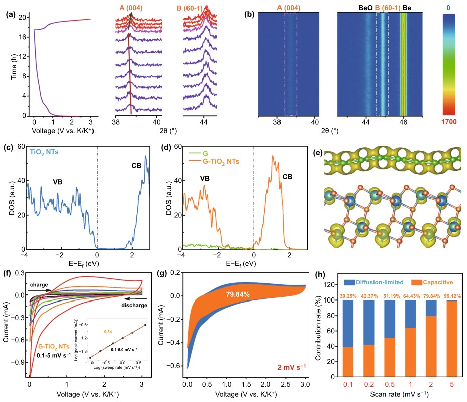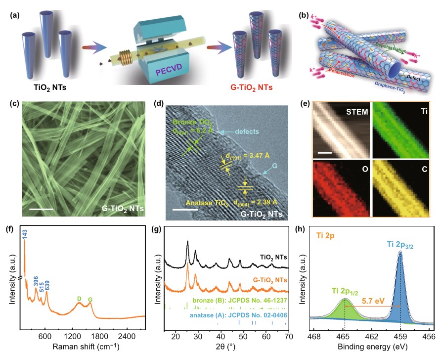 本工作通过PECVD技术设计为TiO2纳米管装备石墨烯铠甲:具有丰富缺陷结构的石墨烯在提升材料导电性的同时,有助于缓解嵌脱钾过程中的体积膨胀/收缩,最终获得了优异的电化学储钾性能。同时,结合多项原位表征技术的运用,从形貌和结构全面揭示了TiO2的储钾机制。