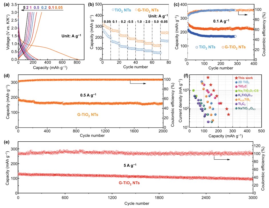 烯碳铠甲保护的TiO2纳米管负极展现了良好的储钾能力,即使在5.0 A g‒1的大电流密度下,仍具有较高的容量和循环稳定性(图2),相比于其他钛系材料储钾性能具有优势。