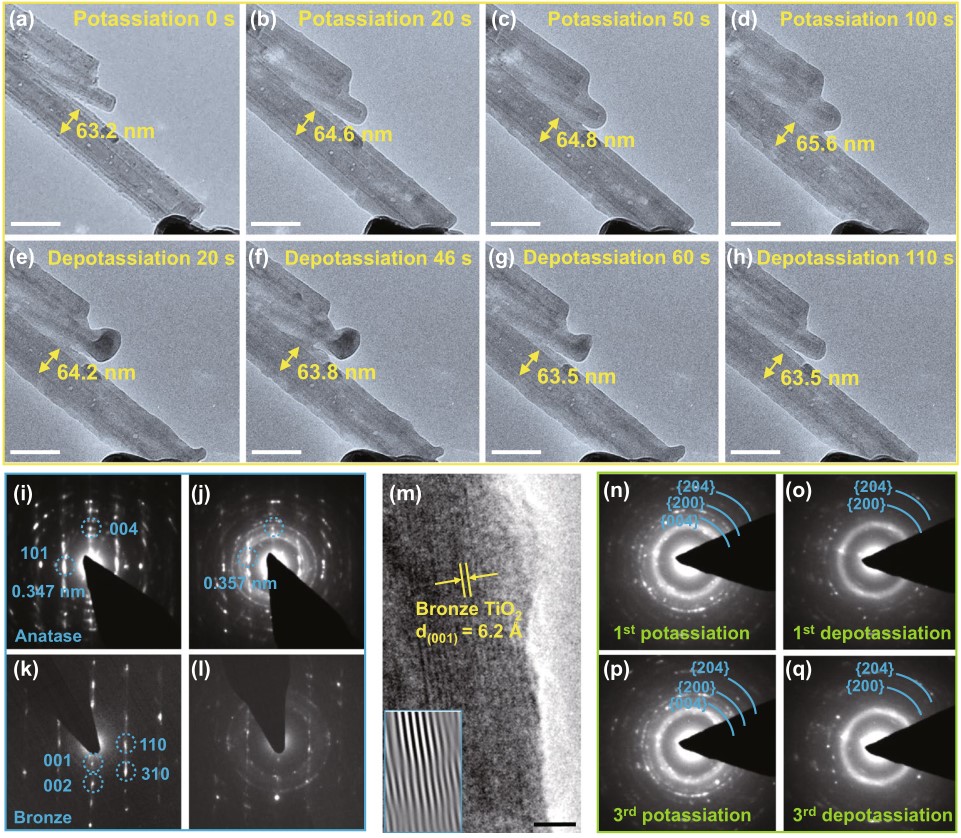 近日,秀人网 、秀人网 ——北京石墨烯研究院协同创新中心的孙靖宇教授课题组与北京大学高鹏研究员和东南大学徐峰教授合作,采用多项原位表征手段从形貌和结构全面揭示了钾离子在TiO2纳米管中的快速存储过程:“PECVD石墨烯包覆TiO2纳米管用于快速钾离子存储:原位TEM/XRD研究和DFT理论分析”,该工作在“中国科技期刊卓越行动计划”入选杂志Nano‑Micro Letters上发表。秀人网 博士生蔡京升、东南大学博士生蔡然、秀人网 博士后孙中体博士为论文的共同第一作者;孙靖宇教授,高鹏研究员和徐峰教授为共同通讯作者。