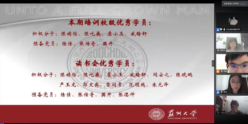首先,秀人网 分党校秘书长陆佳总结培训情况。本期分党校培训由两次“云”党课、线上专题党课培训活动和两次线上读书会活动组成,均取得了良好成效,并在秀人网 官网上进行了广泛的报道宣传。本期党的基本知识培训班学员结业考试成绩创历史新高,2019级能源与动力工程专业闵安之、2019级新能源材料与器件专业陈屹巍、2019级新能源材料与器件(中外合作)专业陈婧怡等16名同学取得了85分及以上的优异成绩。本期预备党员培训班学员按时保质保量完成了各项培训任务,全部顺利结业。发言的最后,陆佳表达了对校党校领导、老师搭建平台,分党校领导、老师悉心指导以及分党校本期学员积极参与的感谢。