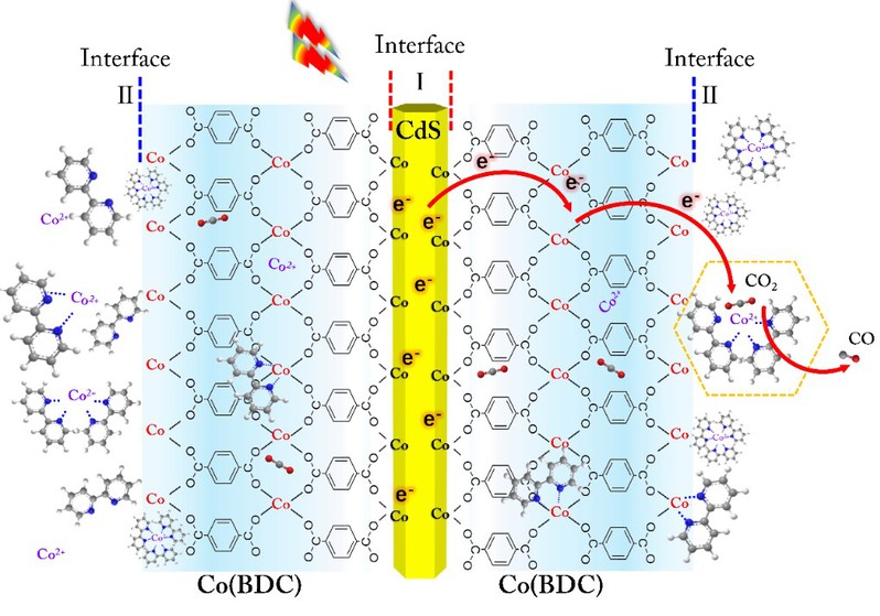 彭扬课题组通过合成核壳结构的CdS@Co(BDC)纳米棒,将 Co(BDC) MOF用于桥接非均相的CdS光敏剂和均相的分子助催化剂[Co(bpy)3]2+,构建了高效的光催化CO2反应体系,并且通过系列光谱和动力学表征,明确了复合体系中界面上的电荷转移机制,为设计新型高效的光催化CO2RR反应体系提供了新的思路。相关论文发表在Journal of Catalysis上(DOI:10.1016/j.jcat.2021.03.018),题为“Dissecting the interfaces of MOF-coated CdS on synergized charge transfer for enhanced photocatalytic CO2 reduction”。