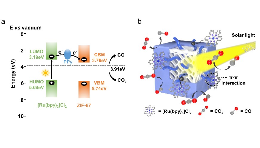 3. 通过对于材料能带结构的表征,提出合理的反应路径:其中导电的PPy将光敏剂产生的光生电子有效传递到ZIF-67的活化中心上,完成2e-的催化还原反应。