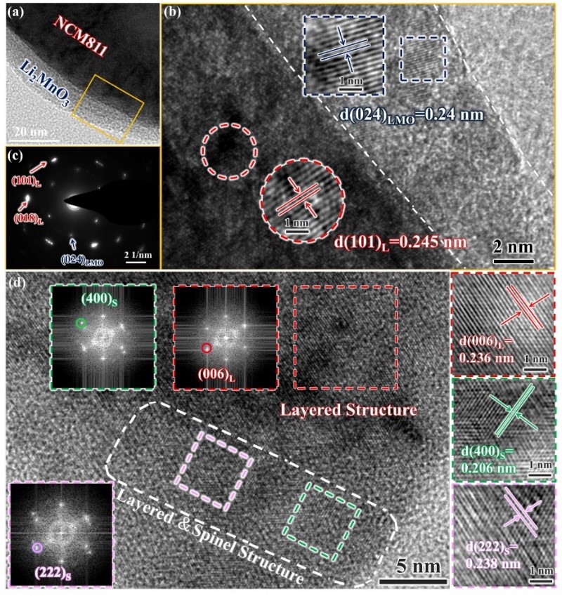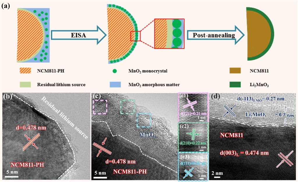 图2. (a)基于EISA技术的NCM811原位包覆Li2MnO3纳米层的合成机理图。相应材料的HRTEM图:(b)预烧中间相NCM811-PH,(c)MnO2包覆后NCM811-PH@MnO2和(d)Li2MnO3包覆后NCM811@LMO-3%材料。
