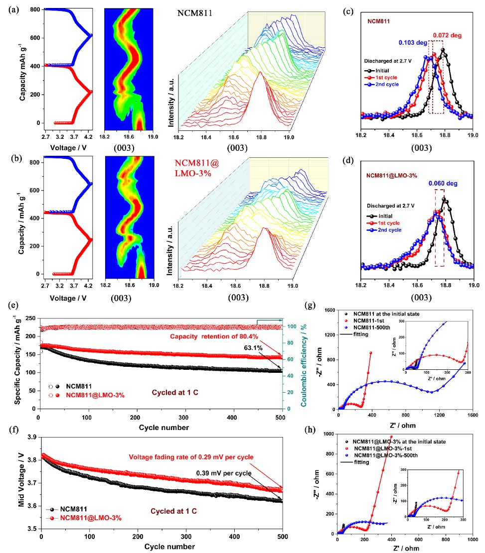 图5.纯NCM811和经包覆NCM811@LMO-3%正极材料原位In-situ XRD表征的(a,b)前两圈充放电曲线与003衍射峰的二维等高线图和三维谱图以及(c,d)003特征峰在初始状态和循环后深度放电至2.7 V时的峰值偏移。两种正极材料在1 C倍率下500次循环的电化学性能:(e)循环容量曲线,(f)循环电压曲线以及(g,h)循环前后的EIS对比曲线。