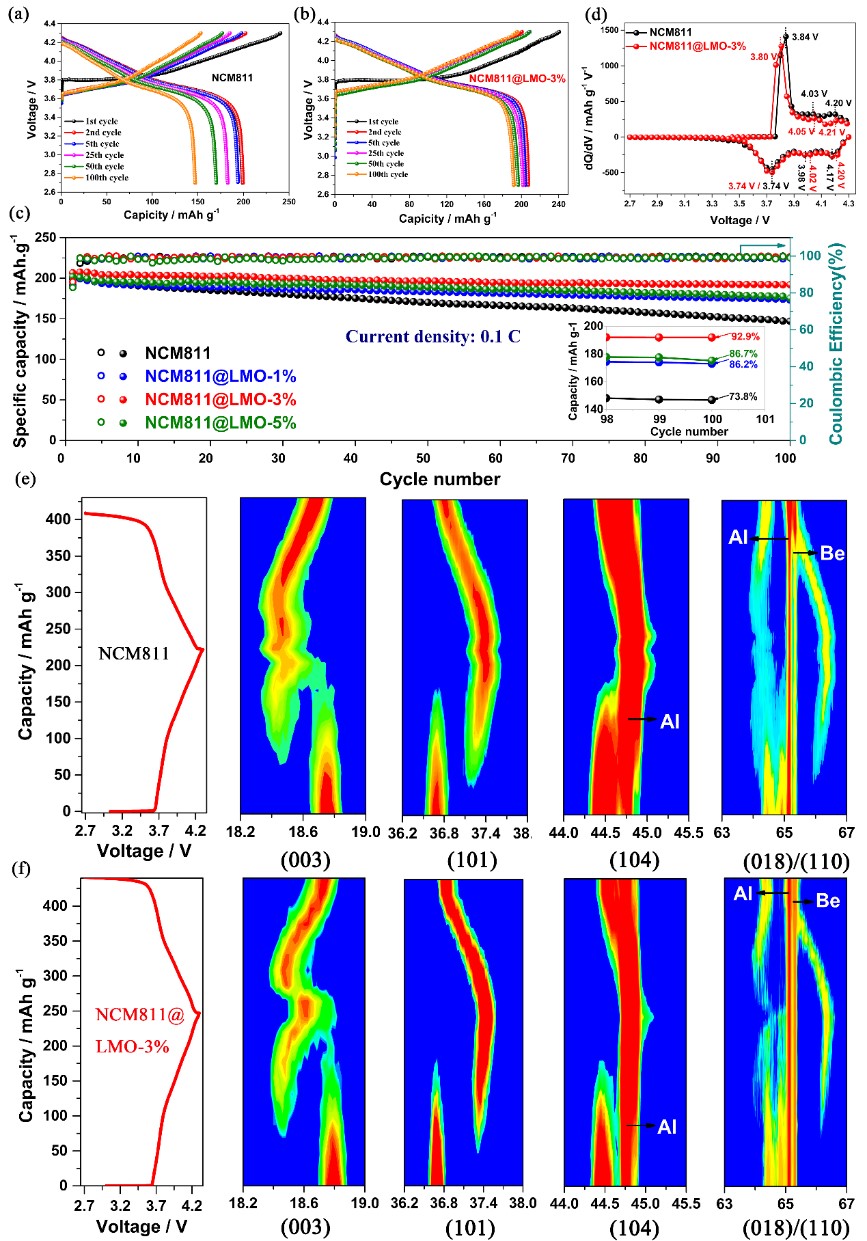 图4.纯NCM811和经包覆NCM811@LMO-3%正极材料在2.7-4.3 V 电位区间内和0.1 C倍率下的(a,b)充放电曲线,(c)循环容量曲线及(d)首次循环的dQ/dV曲线。(e,f)原位XRD测试的首次充放电曲线及特征衍射峰(003,101,104和018/110)的二维等高线图。
