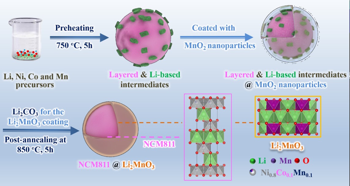 图1. NCM811颗粒表面包覆Li2MnO3纳米层的过程示意图。