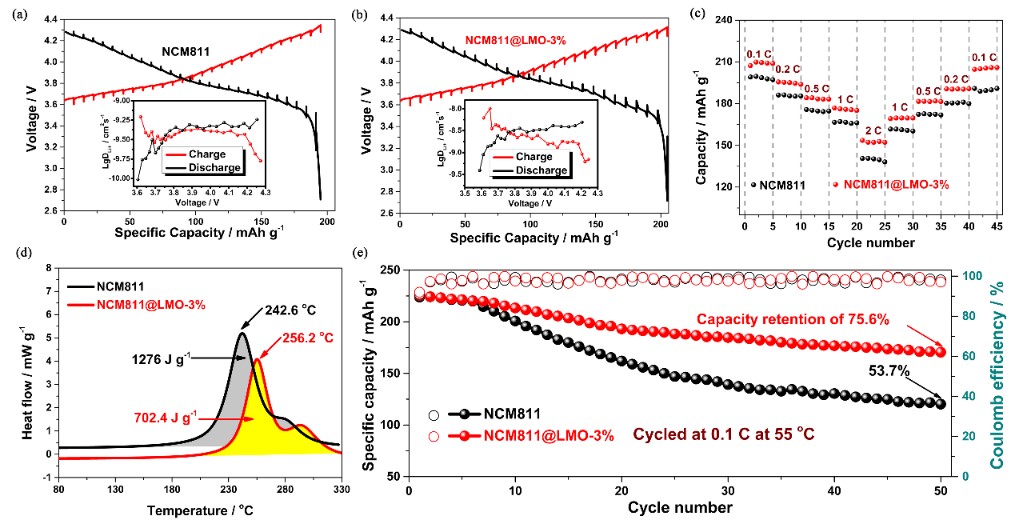 图7 . 纯NCM811和经包覆NCM811@LMO-3%正极材料的(a,b)GITT曲线与锂离子扩散系数,(c)高倍率性能,(d)DSC曲线和(e)高温循环容量曲线。