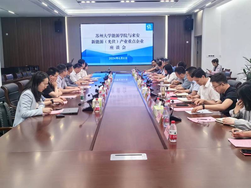 接着,王海波副院长介绍了化电所的基本情况,尹万健、杨新波、邹培超、张金灿、赵杰五位教授分别围绕光伏材料的计算仿真、高效异质结和叠层太阳能电池、储能与动力电池研究部有关情况、石墨烯薄膜材料的批量制备与应用、面向薄膜和光电器件的材料设计等方面作汇报交流。来安百佳年代薄膜科技有限公司总经理陈海军,滁州捷泰新能源科技有限公司副总经理欧阳建波,滁州优胜高分子材料有限公司董事长孟勇分别介绍公司情况及技术需求。双方与会人员就进一步挖掘院地双方合作潜力,助力实现政产学研一体化、高质量发展目标进行了深入探讨。