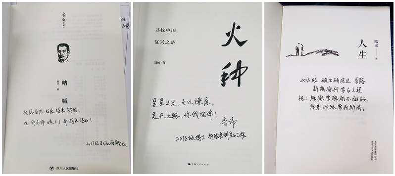 在“青春向党,书香领航”图书捐赠活动中,毕业生党员们向学院党委捐赠了《火种》、《呐喊》、《毛泽东传》、《浴血荣光》等书籍,并在扉页留下了对学院和师弟师妹们的寄语:“不忘初心、砥砺前行,长路漫漫,未来可期”(2018级博士生马勇);“愿你们以梦为马,不负韶华,拥有一个如焰色反应般绚烂多彩的人生”(2018级硕士生李巧艳)。