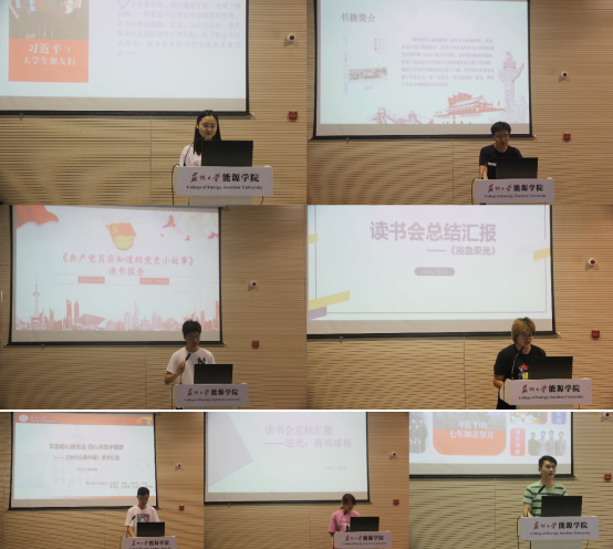 述职报告结束后,各读书小组代表进行了读书报告分享展示,向大家展示本组的读书成果,与大家一起交流读书感悟。通过各个小组的汇报,学员们更进一步地了解了《习近平与大学生朋友们》、《聚焦星空:潘君骅传》、《共产党员应知的党史小故事》、《追光:薛鸣球传》、《习近平的七年知青岁月》、《浴血荣光》、《为什么是中国》等书籍,共同回顾了中国共产党百年奋斗历程中的光辉岁月,感悟了党的伟大精神,提高了自己的党性修养,加深了爱党爱国爱苏大的热情。