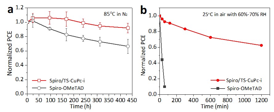Figure 5. Stability of the devices without and with the ultra-thin TS-CuPc layer (a) at 85oC under N2; (b) at 25oC in air with 60-70% relative humidity.
