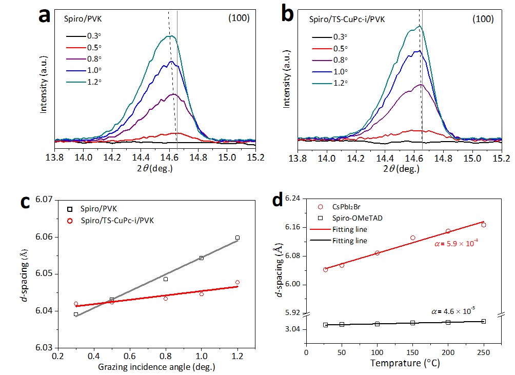 图2. (a,b) 在不同衬底上生长的CsPbI2Br薄膜的(100)晶面的深度依赖的GIXRD图谱。(c) CsPbI2Br薄膜的(100)晶面间距与X射线掠入角的关系图。(d) CsPbI2Br和Spiro-OMeTAD薄膜的晶面间距与XRD测试温度的关系图。
