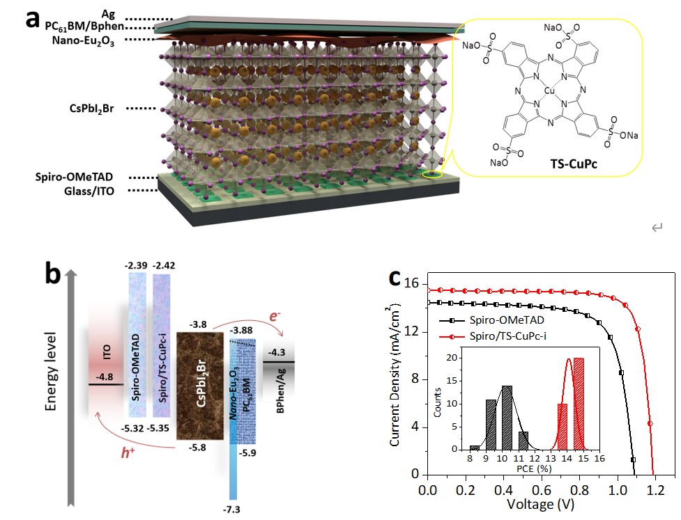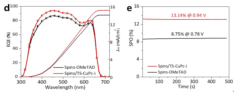 在我们的制备条件下,基于Spiro-OMeTAD/TS-CuPc的倒置器件效率可达到14.85%,优于基于Spiro-OMeTAD、NiOx、PEDOT:PSS以及NiOx/TS-CuPc、PEDOT:PSS/TS-CuPc的一系列器件。与基于Spiro-OMeTAD的参比器件相比,基于Spiro-OMeTAD/TS-CuPc的器件的热稳定性和空气稳定性也得到显著提高。该研究为倒置结构器件中空穴层或衬底层与无机钙钛矿之间的界面应力调控以及器件性能优化提供了新的策略。