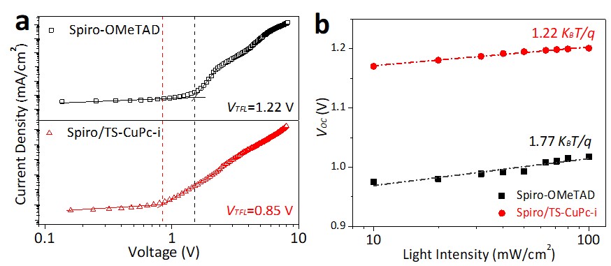 Figure 4. (a) J-V characteristics in dark measured for electron-only devices with different underlayers, displaying their VTFL kinkpoint behavior. (b) Plot of VOC response versus incident light intensity.