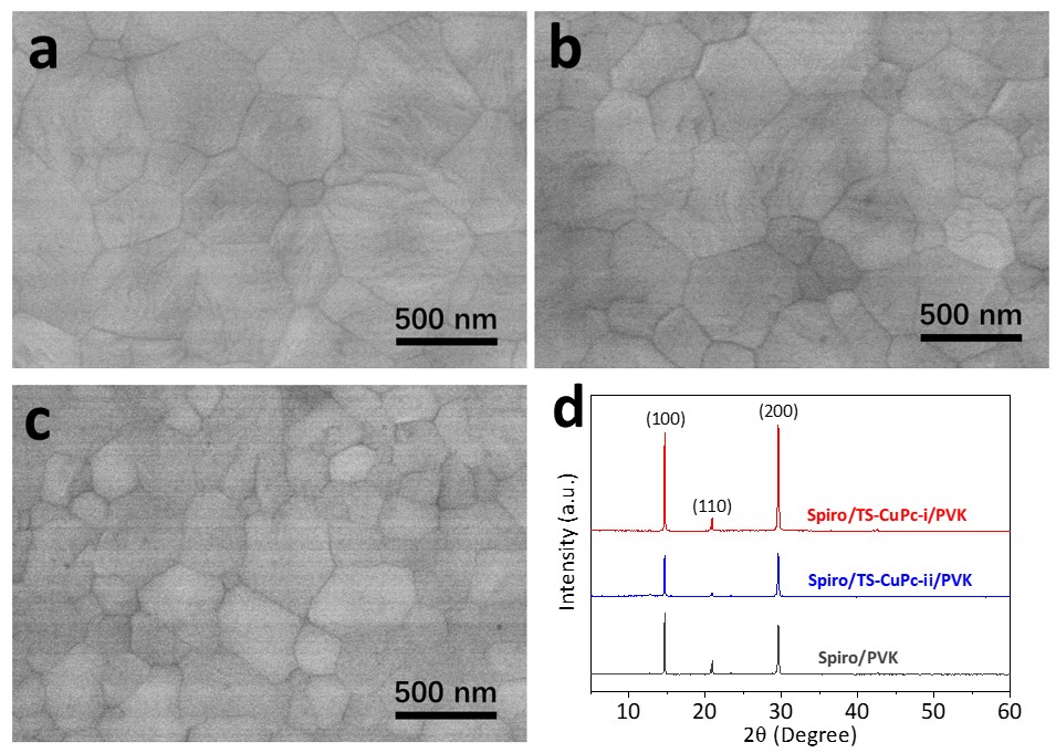 图1. (a) Spiro/TS-CuPc-i/PVK, (b) Spiro/TS-CuPc-ii/PVK 和 (c) Spiro/PVK 薄膜的SEM图像; (d) 所有薄膜的XRD图谱(PVK表示CsPbI2Br)。