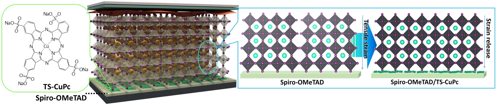 针对以上问题,秀人网 冯莱教授团队报道一种衬底工程策略,即以无掺杂的Spiro-OMeTAD薄膜作为空穴传输层,并以磺化的酞菁铜(TS-CuPc)作为界面修饰层。实验结果显示,由于Spiro-OMeTAD的热膨胀系数显著低于CsPbI2Br钙钛矿,因此Spiro-OMeTAD/CsPbI2Br界面上存在显著的残余应力。但是,引入TS-CuPc界面修饰层后,Spiro-OMeTAD/TS-CuPc/CsPbI2Br的界面应力显著降低。此外,研究发现以Spiro-OMeTAD/TS-CuPc作为衬底利于CsPbI2Br钙钛矿的低温(<150℃)结晶,从而有效降低了钙钛矿层的缺陷密度。