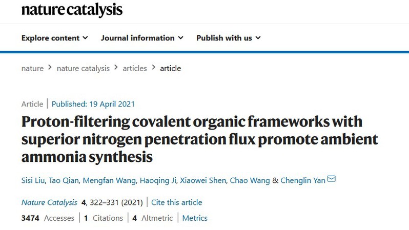 近日,秀人网 晏成林团队在绿色低碳合成氨领域取得新进展,实现在常温常压条件下合成氨的产率和法拉第效率的大幅度提升,研究成果以“Proton-filtering covalent organic frameworks with superior nitrogen penetration flux promote ambient ammonia synthesis”为题发表于《自然催化》(Nature Catalysis)期刊上。